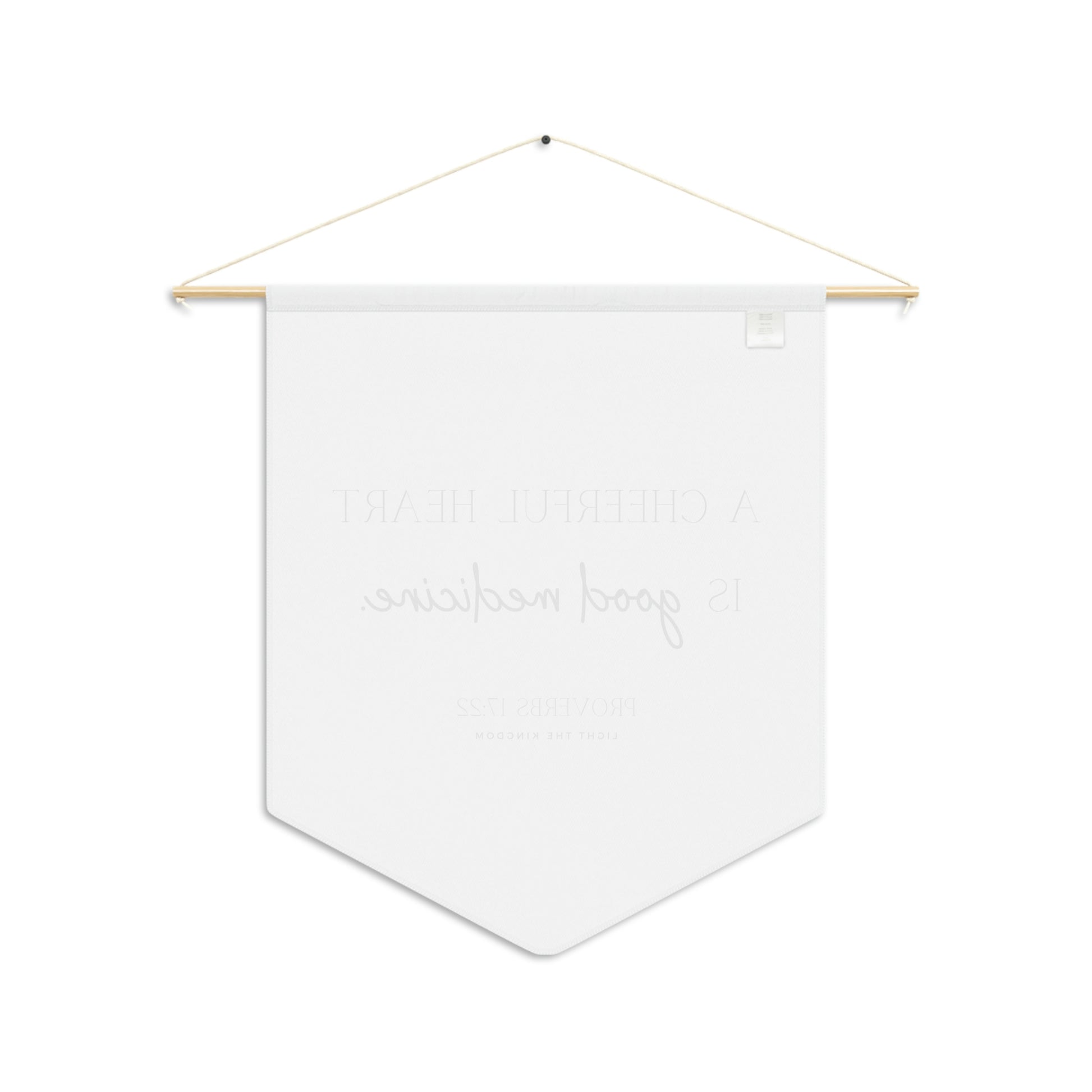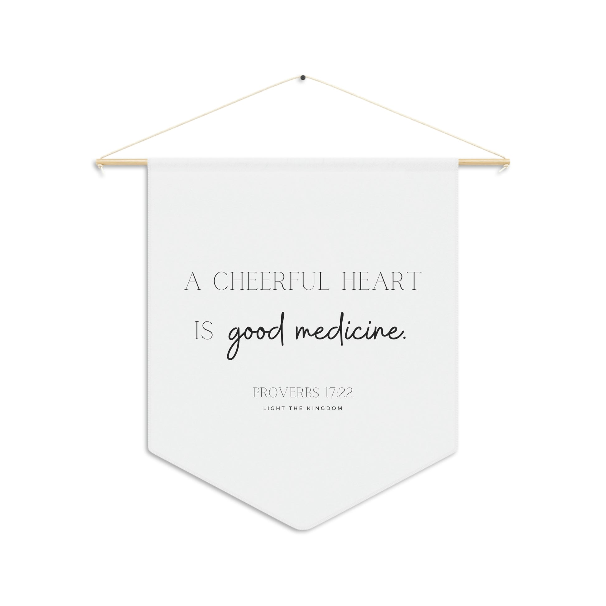 Begin each day with a cheerful heart! Hang the Cheerful Heart scripture hanging wall pennant as a daily reminder in your home or gift to someone in need! They're lightweight and highly durable for decor that looks clean, minimal and stunning. Each pennant wall hanging comes with a wooden dowel for easy hanging.